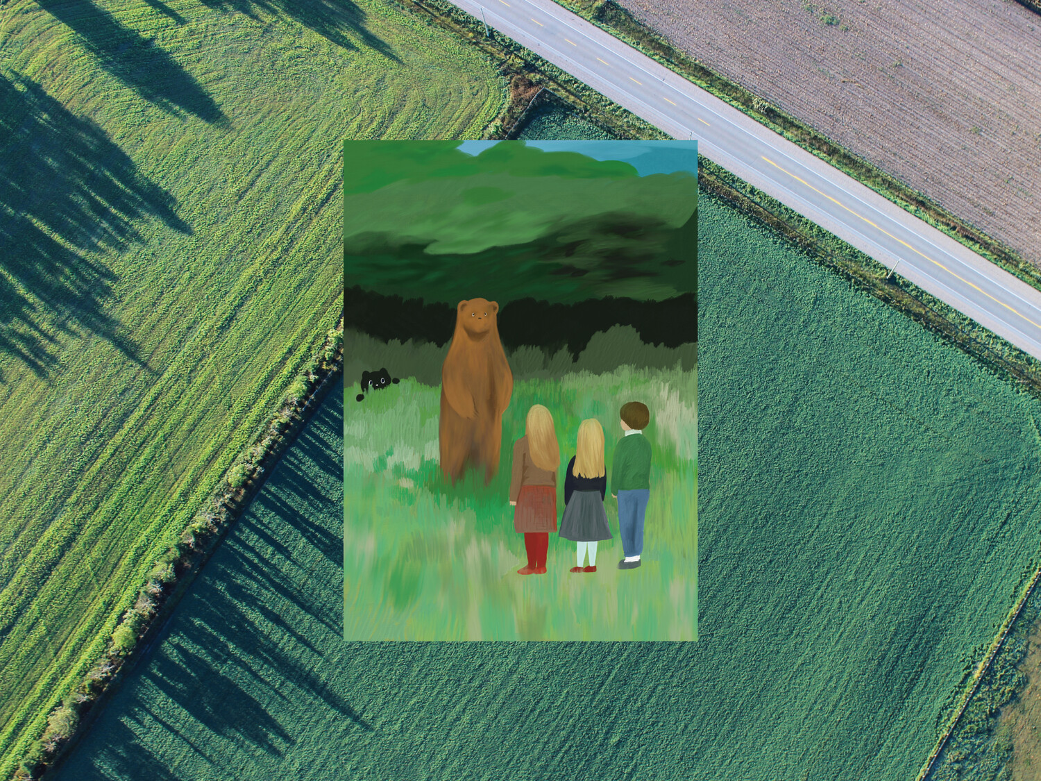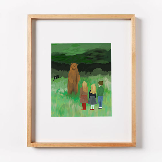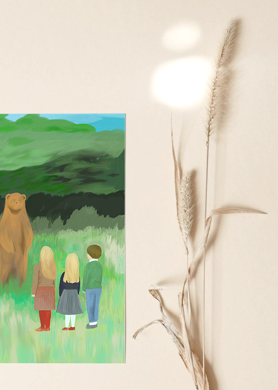 곰돌이와 고양이, 아이들이 그려진 귀여우면서도 색감이 좋은 유화 스타일의 그림이에요