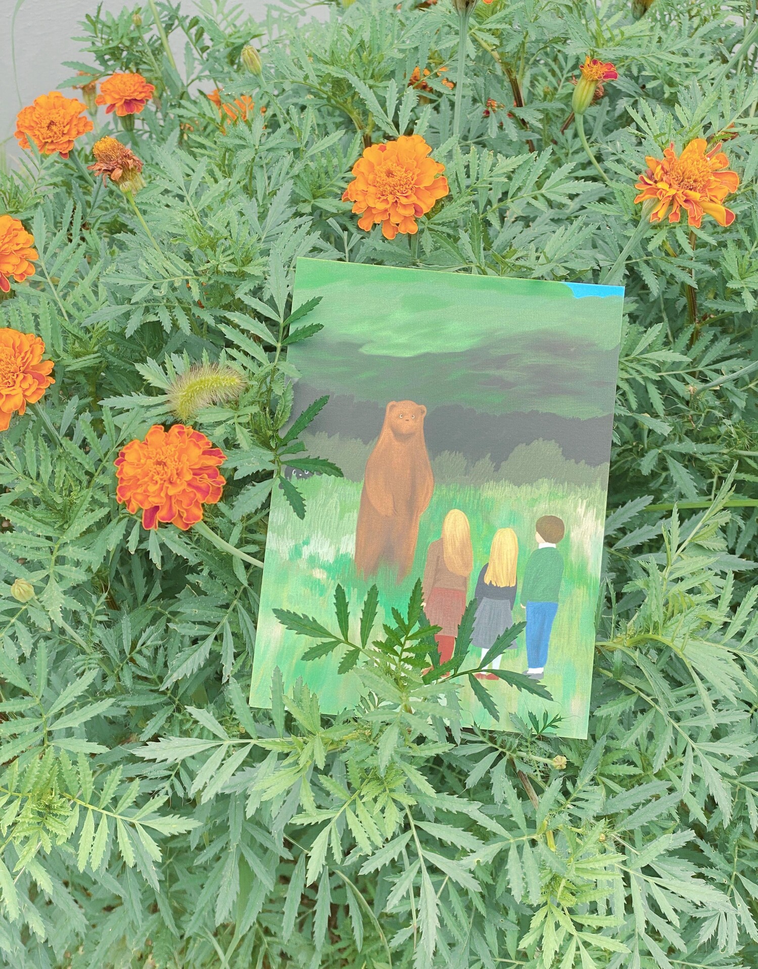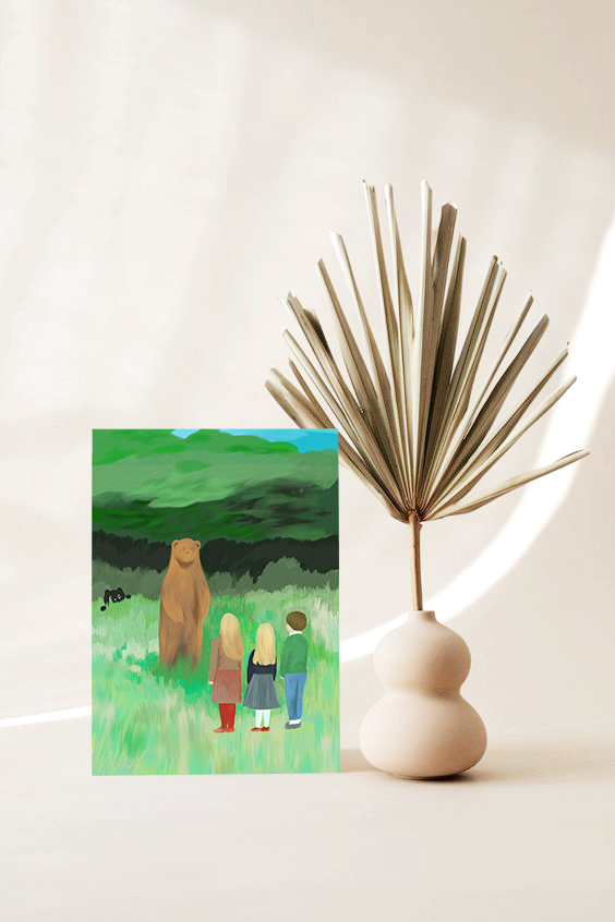 무서운 곰 앞에서 얼어버린 아이들과 곰의 뒤에서 몰래 숨어있는 고양이가 눈에 띄는 MOUNTAIN BEAR 엽서입니다.