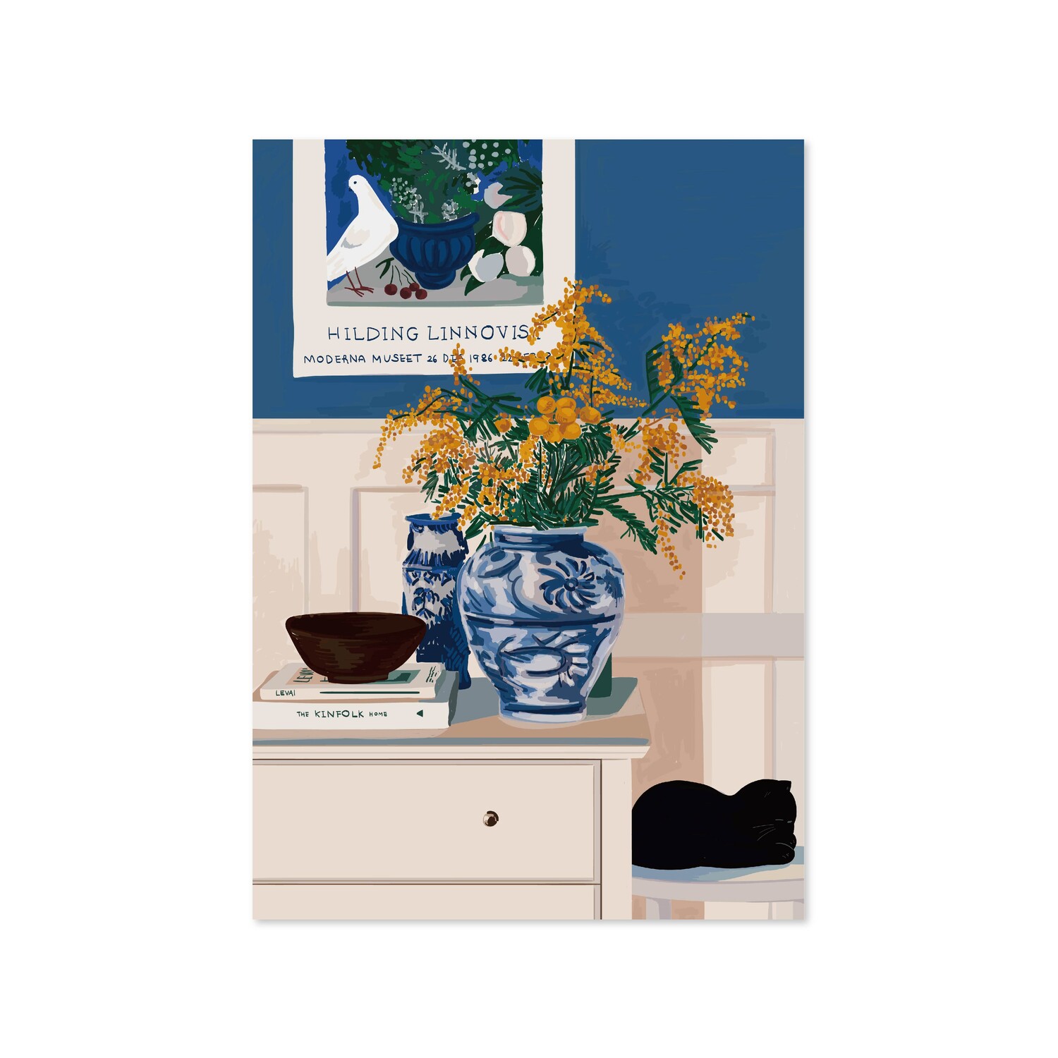 차분한 블루 색상의 고풍적인 인테리어 속에 고양이의 낮잠이 어우러진 BLUE ROOM 그림입니다.
