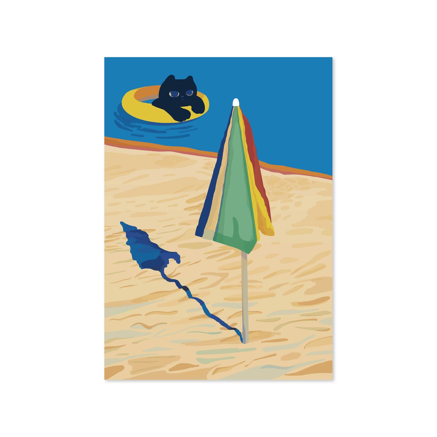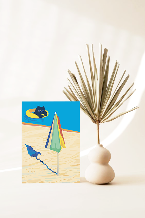 강렬한 햇빛 아래에, 시원한 바다 속에서 헤엄치는 아름다운 바캉스의 순간을 담은 BEACH UMBRELLA 그림이에요.
