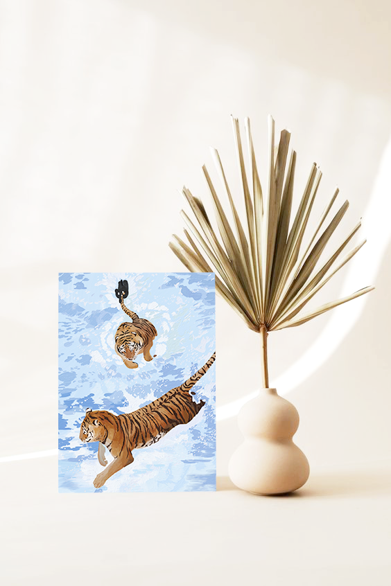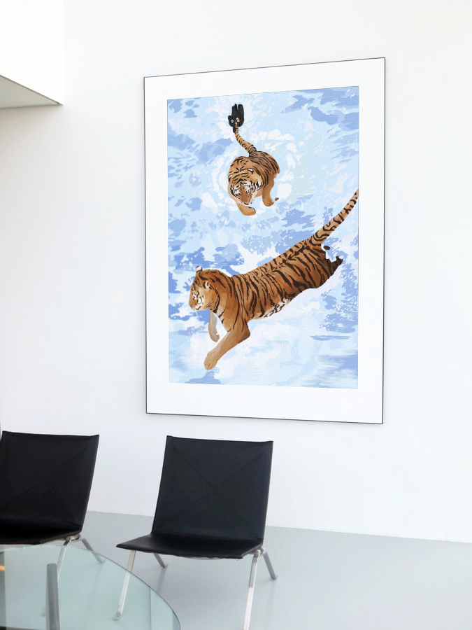 두마리의 호랑이가 뛰놀면서 주위로 물은 퍼지고 첨벙거리는 역동적인 그림이에요