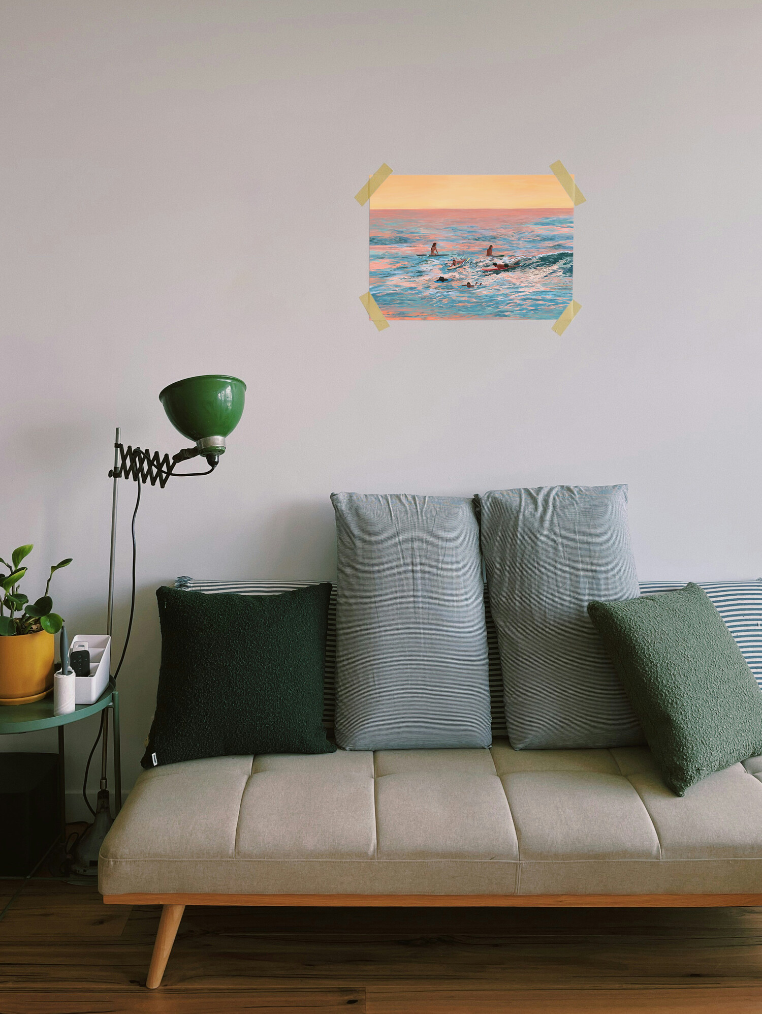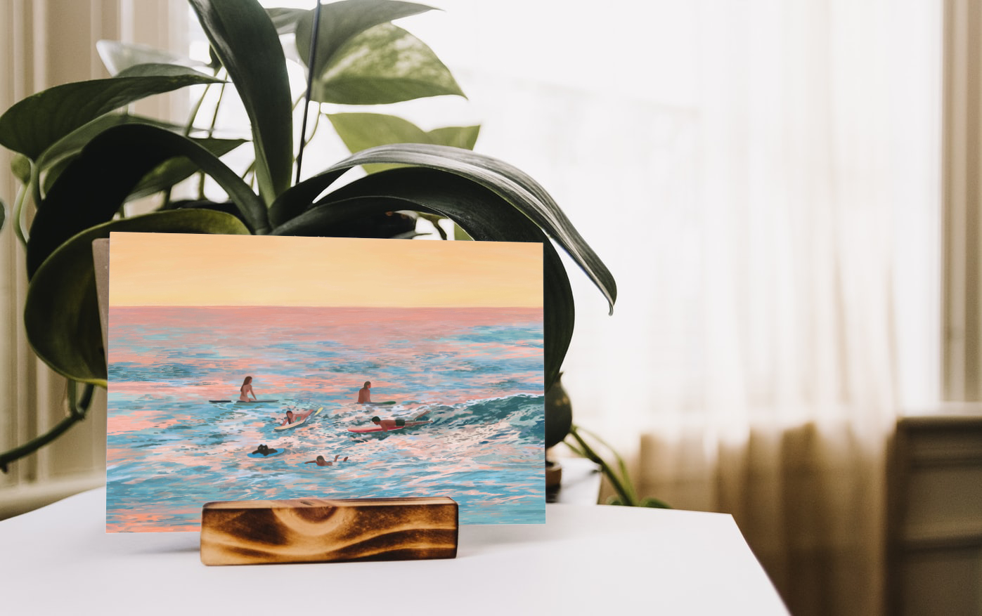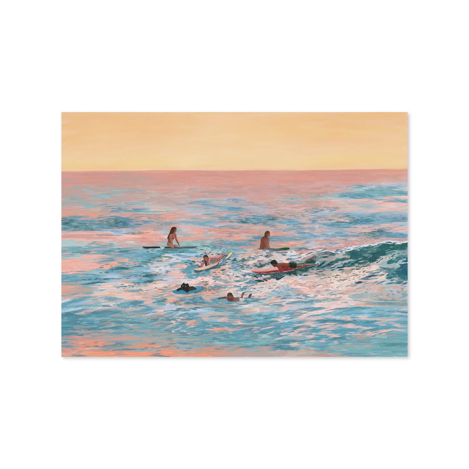 서핑하는 사람들과 고양이가 그려진 차일디시 블루 "Sunset wave" 그림의 아트 엽서입니다.