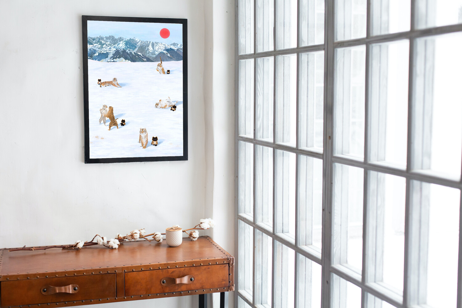 붉은 새해의 기운이 가득한 태양과 설산위로 있는 호랑이들이 인상적인 "TIGER ON SNOW" 아트 엽서입니다.