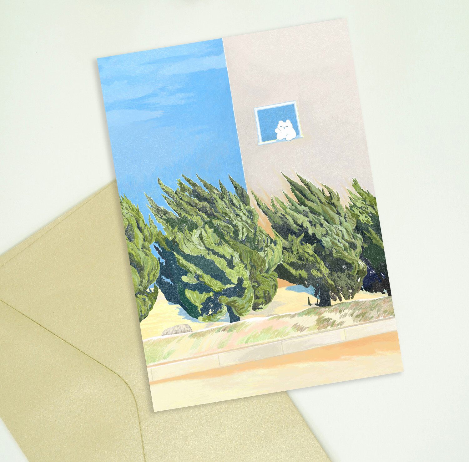 나무가 있는 강릉의 풍경을 담은 그림 "SLANTED TREES" 엽서입니다.