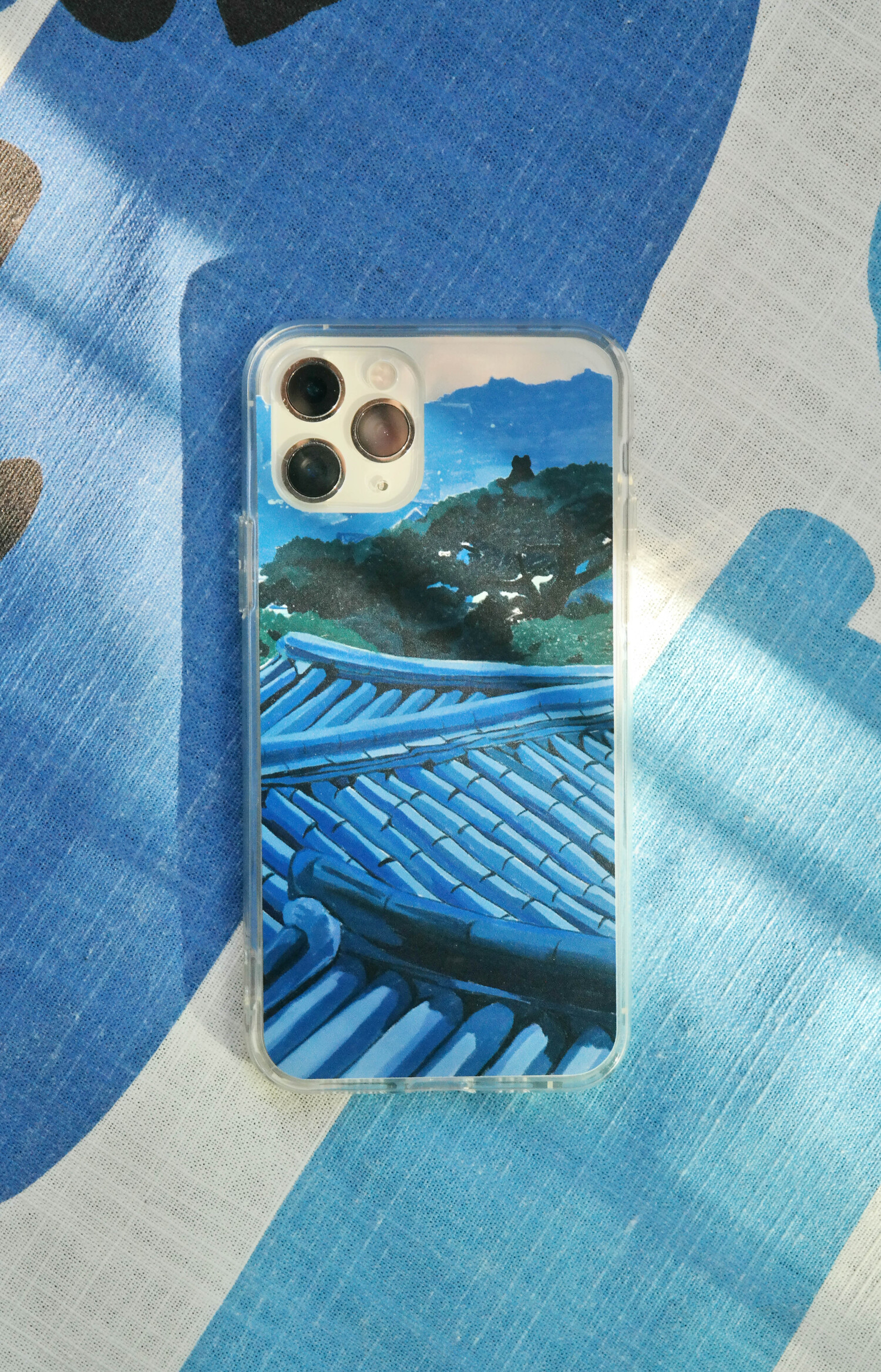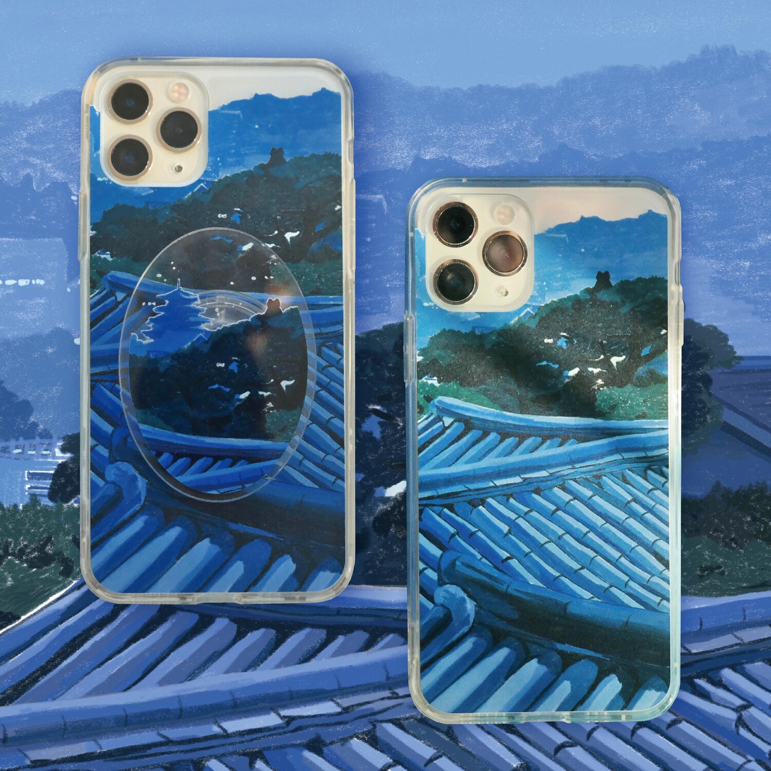 그림의 크롭된 이미지 사이로 핸드폰이 살짝 보이는 투명 케이스입니다.
