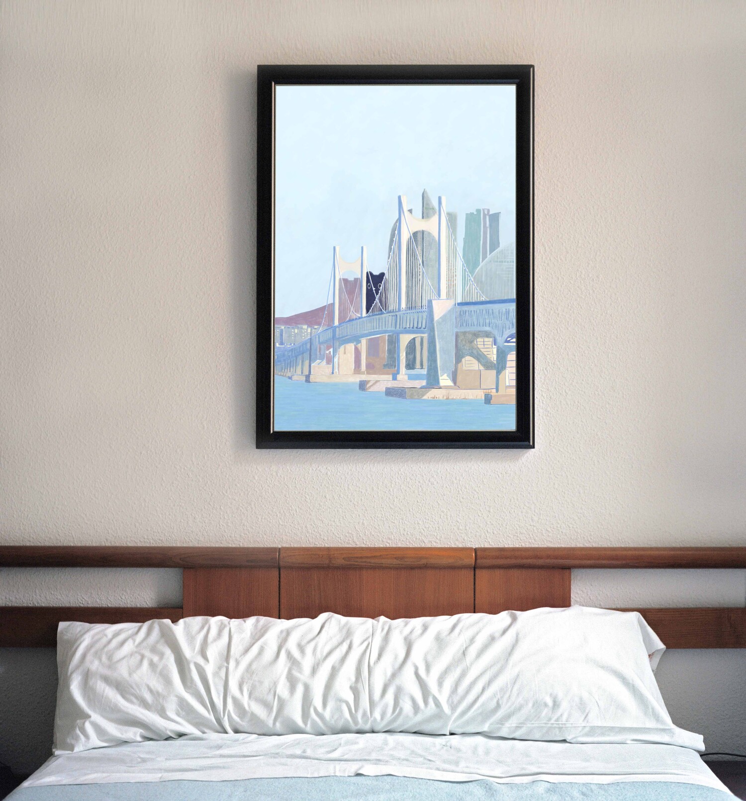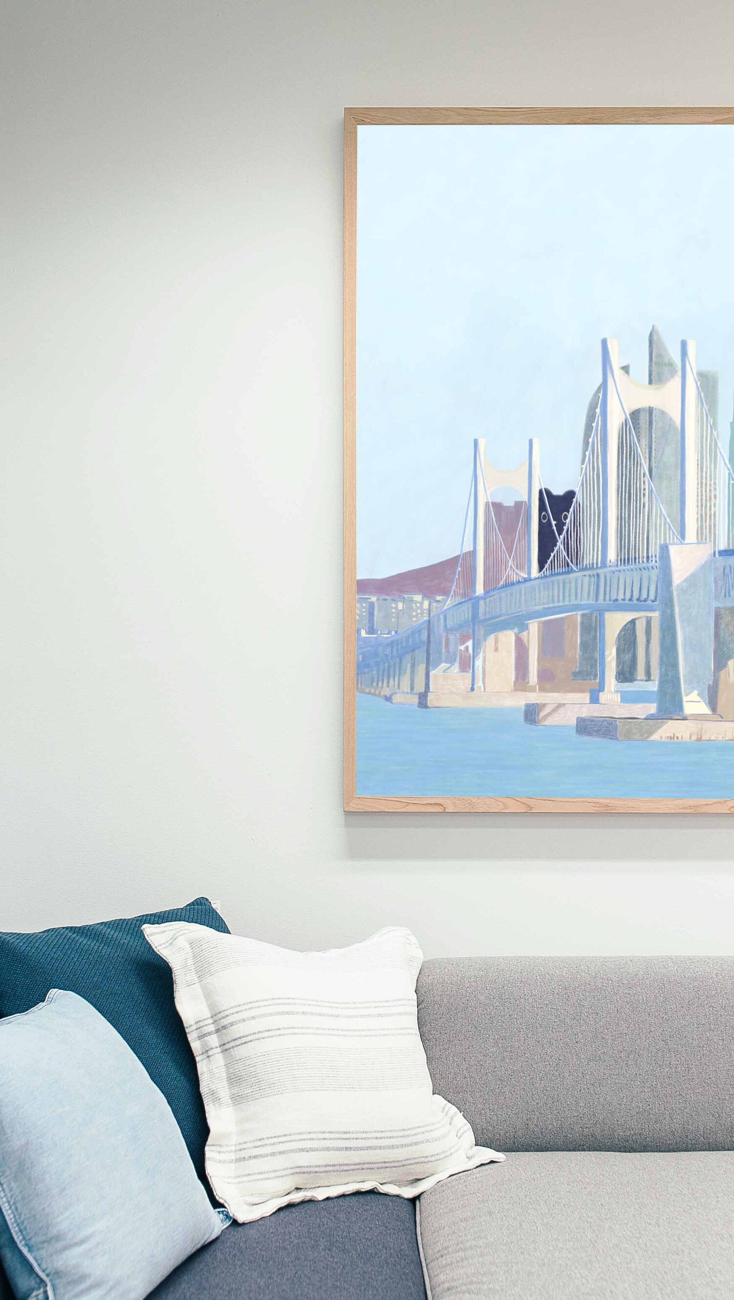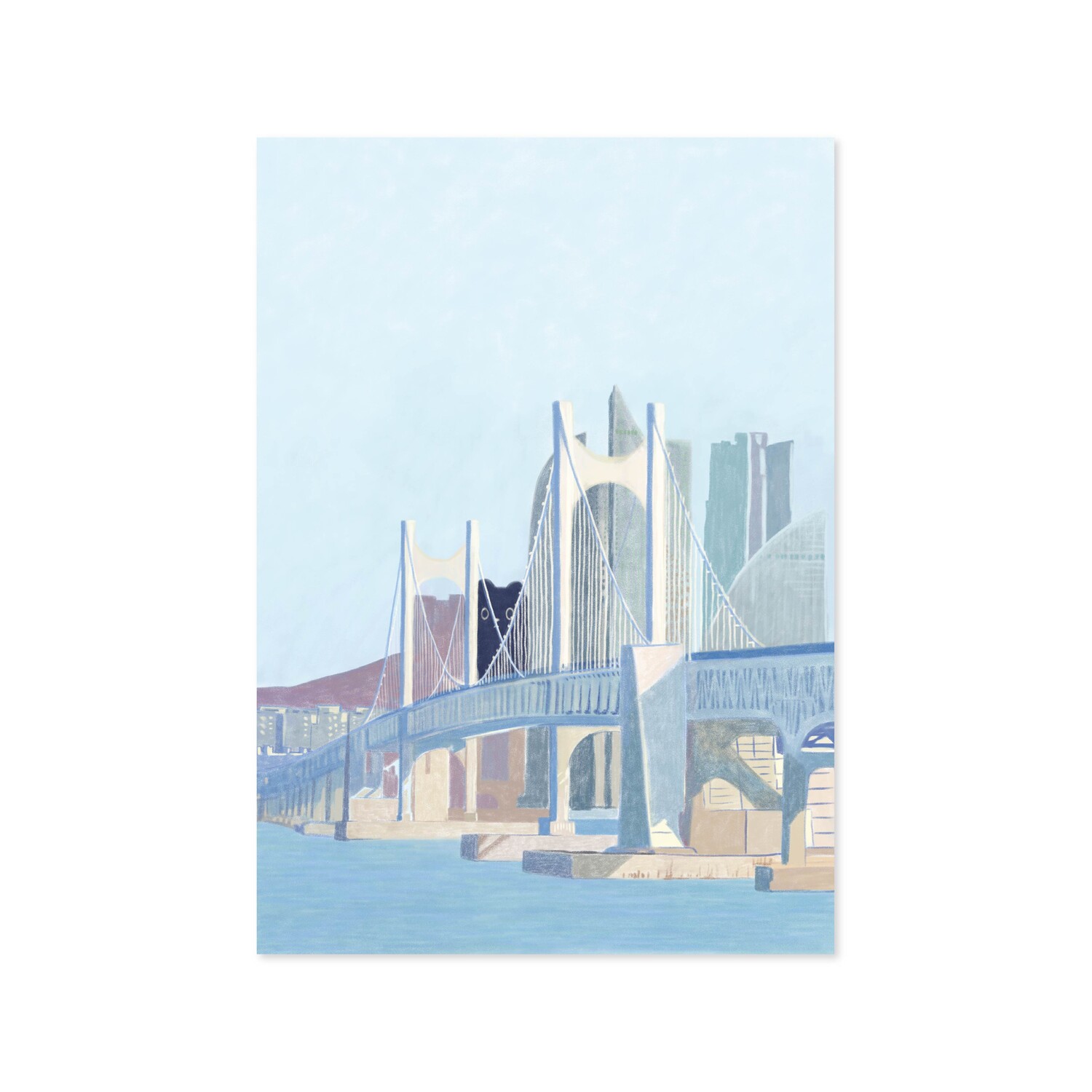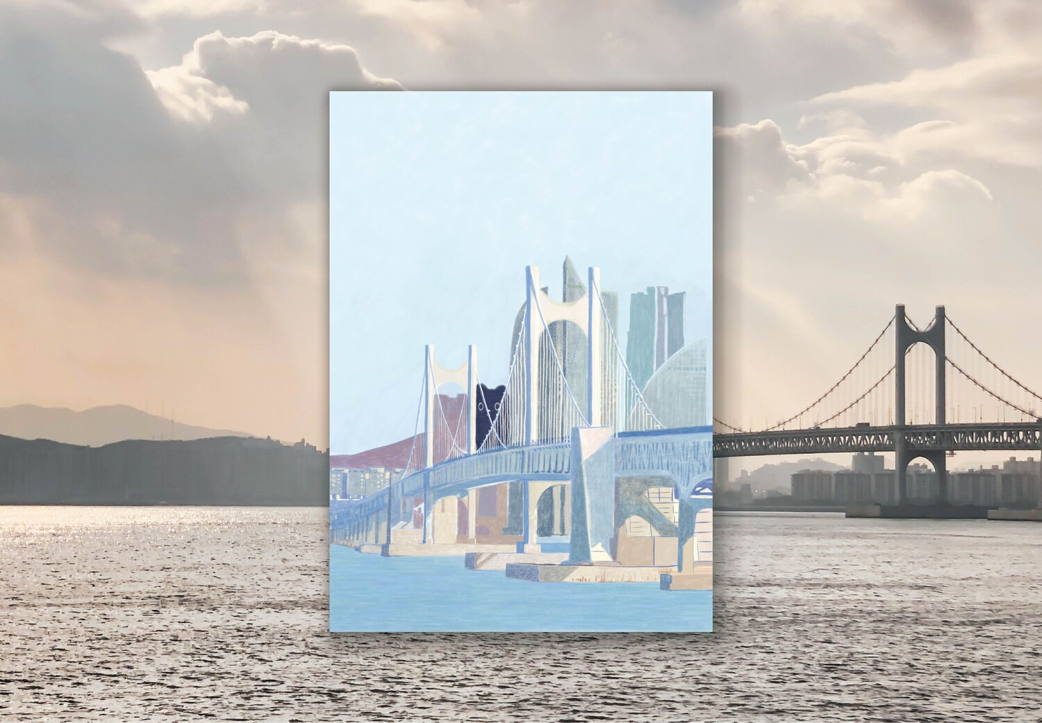 광안대교와 부산 빌딩들 사이로 보이는 꼬미가 킬링포인트인 그림입니다.