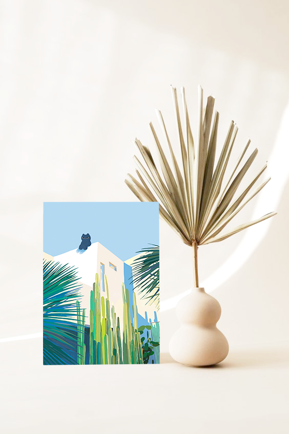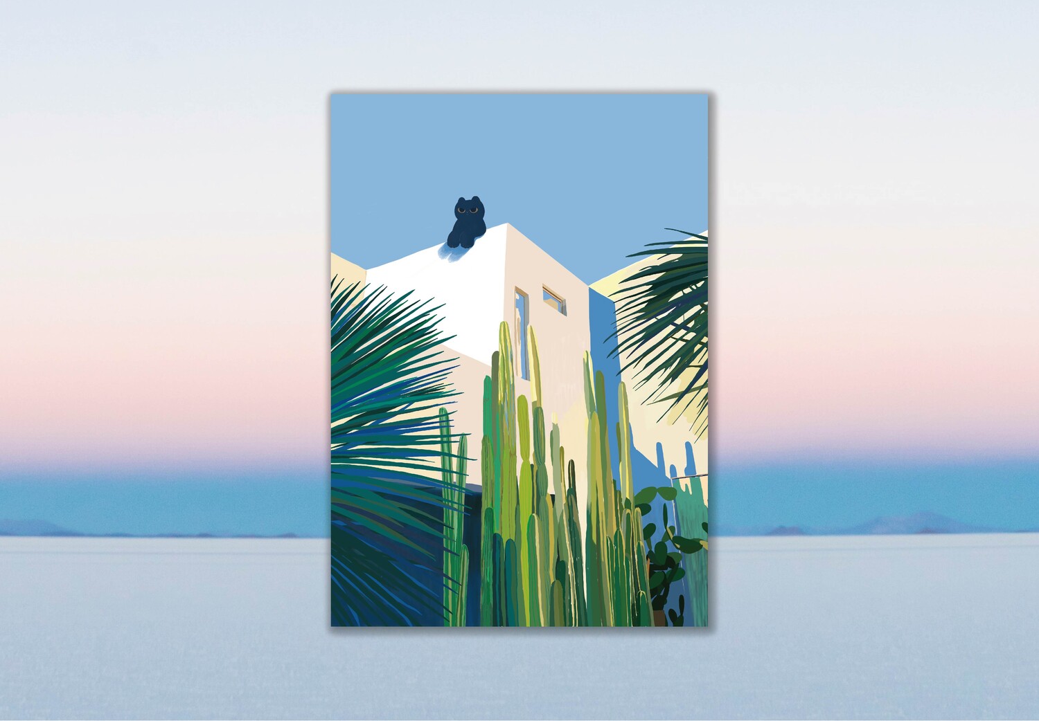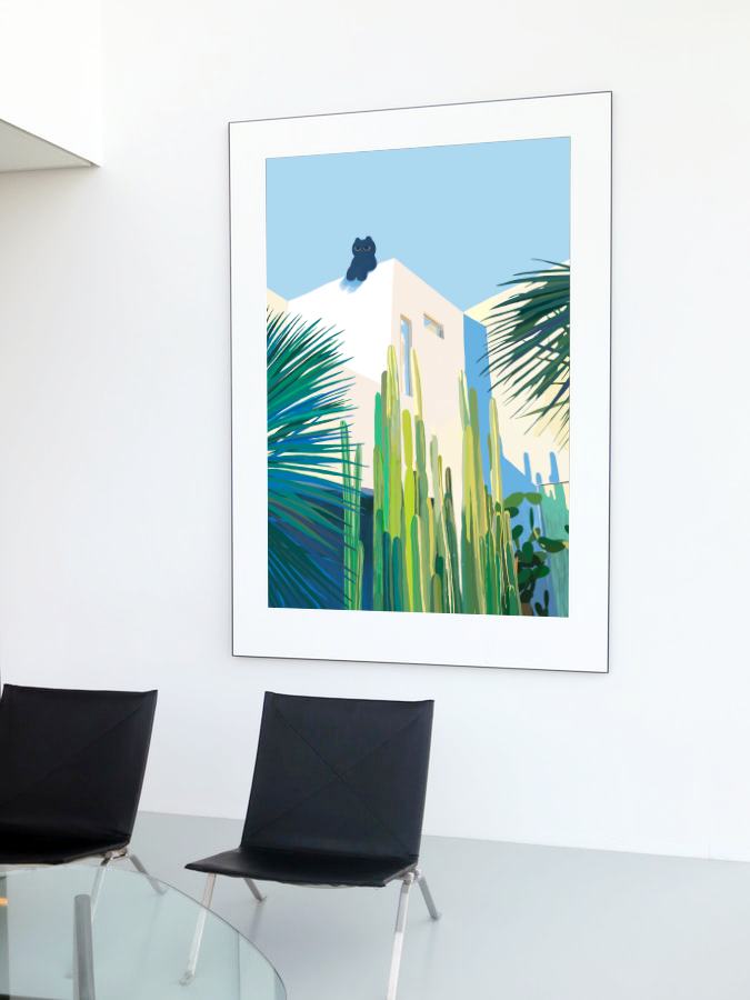 여름의 선인장 녹색과 하늘색의 하늘 여백이 더욱 시원하게 느껴지는 차일디시 블루의 그림 "SUMMER CACTUS" 포스터 입니다.