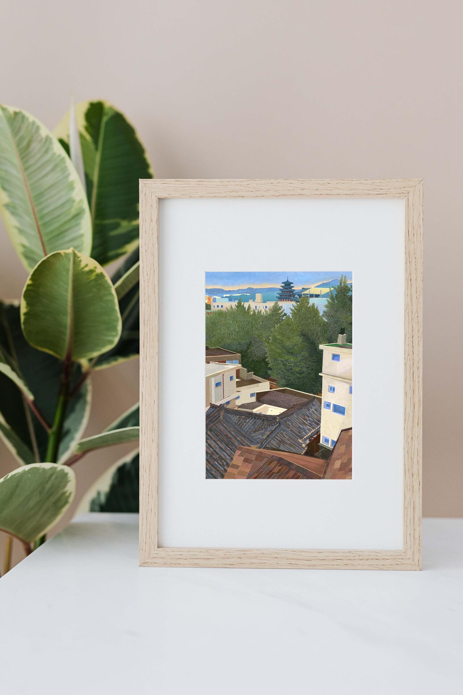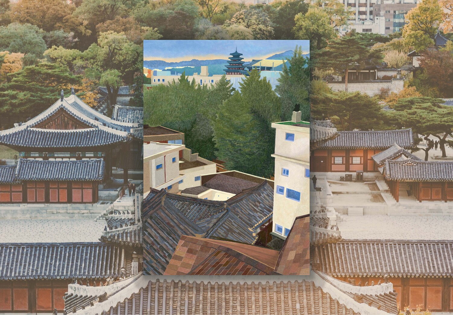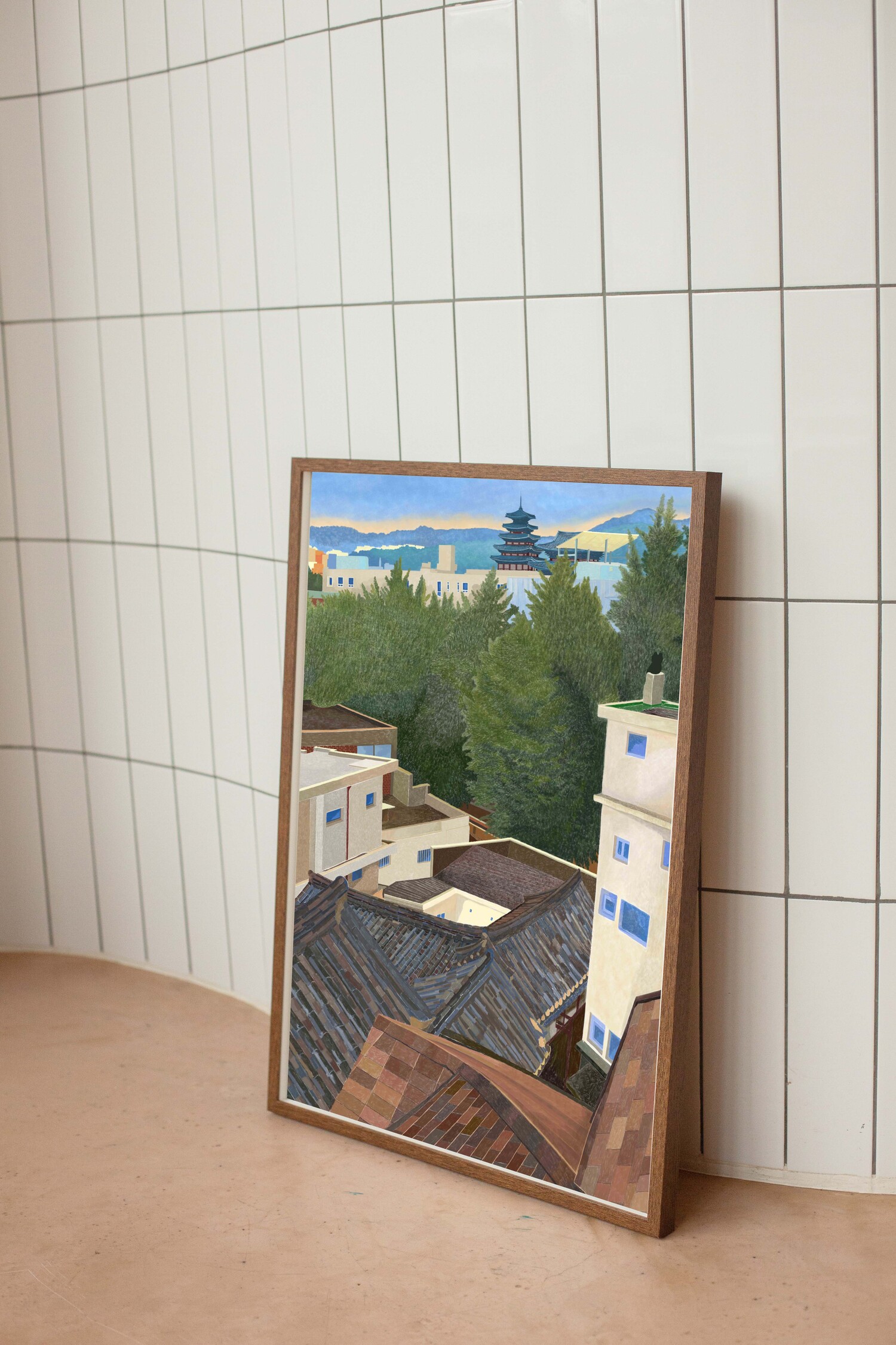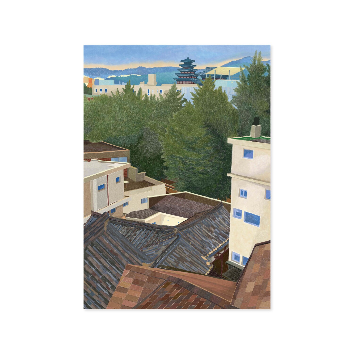 과거와 현재가 공존하는 서울의 북촌 풍경을 담은 그림 "북촌 BUKCHON" 포스터입니다.