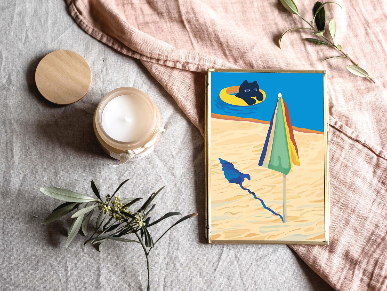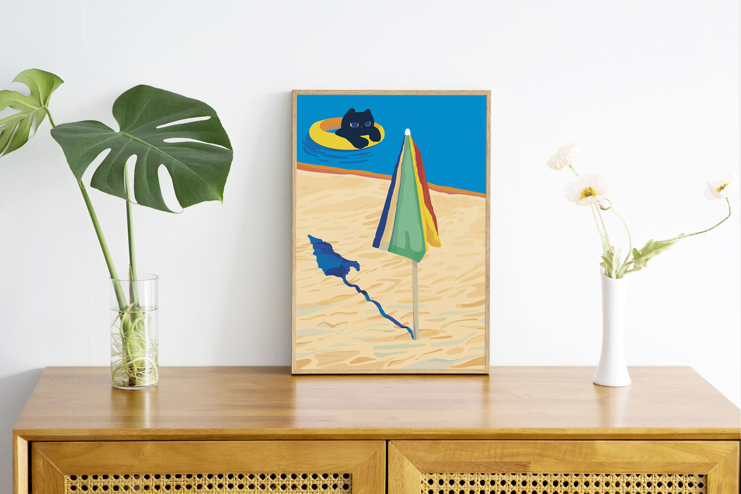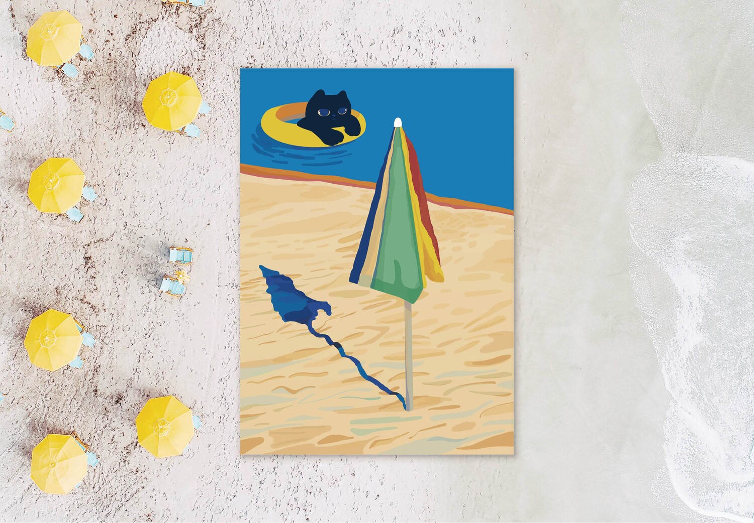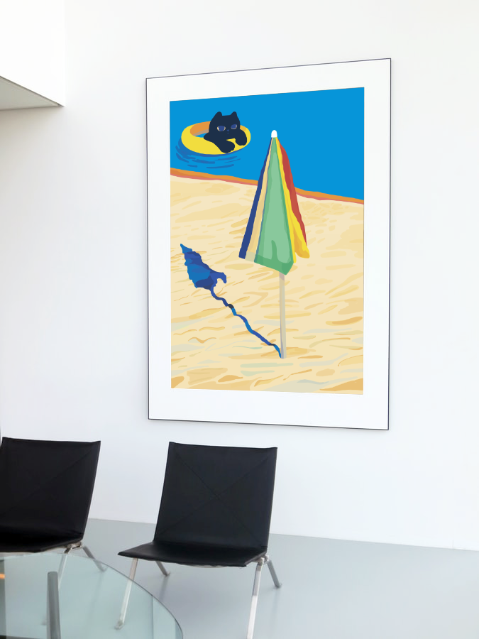 데이비드 호크니의 그림을 패러디한 그림으로 차일디시 블루의 그림 "BEACH UMBRELLA" 포스터 입니다.